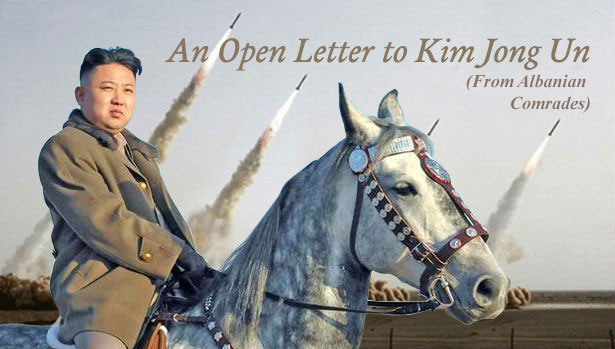Fort i nderuar shoku Kim Jong-un, të dini që Korea e Veriut nuk ndodhet e vetme në këtë përballje kundër imperializmit amerikan dhe koneve të tij. Ju kini shok e shoqe edhe në Shqipëri, të cilët jo vetëm ju nderojnë, por dhe ju japin mbështetjen e plotë për vendin e popullin proletar koreanoverior, pasi ne besojmë se sikurse dhe vendi ynë njëher e një kohë, ju jeni vendi e populli i vetëm në botë të cilët i keni qëndruar besnik linjës marksist-leniniste dhe keni ndjekur në mënyrë ortodokse parimet e materializmit-dialektik, pa deviacione ose shtrembërime të tipit revizionisto-jugosllav ose kinez. Për më tepër, populli heroik tuaj, i ka dëshmuar botës, sikurse Rep. Socialiste e Shqipërisë deri në vitin 1990, se dhe bar ha por armikut dorën kurrë nuk ia shtrin! Pavarësisht reprezaljeve, sanksioneve ekonomike, presioneve ndërkombëtare, populli koreanoverior, nën drejtimin legjendar të Partisë së Punës së Koresë së Veriut nga gjyshi Tuaj deri tek Ju sot, ka arritur t’i bëjë jo vetëm ballë, por t’ua kthejë bumerang armiqve intrigat dhe prapësitë që gatisin në çorbat e tyre.